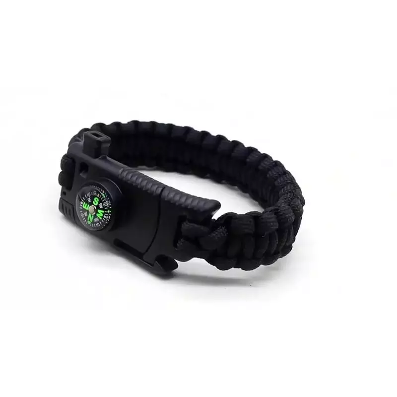 Fire starter, reliable compass, loud emergency whistle, emergency knife, and paracord survival bracelet.